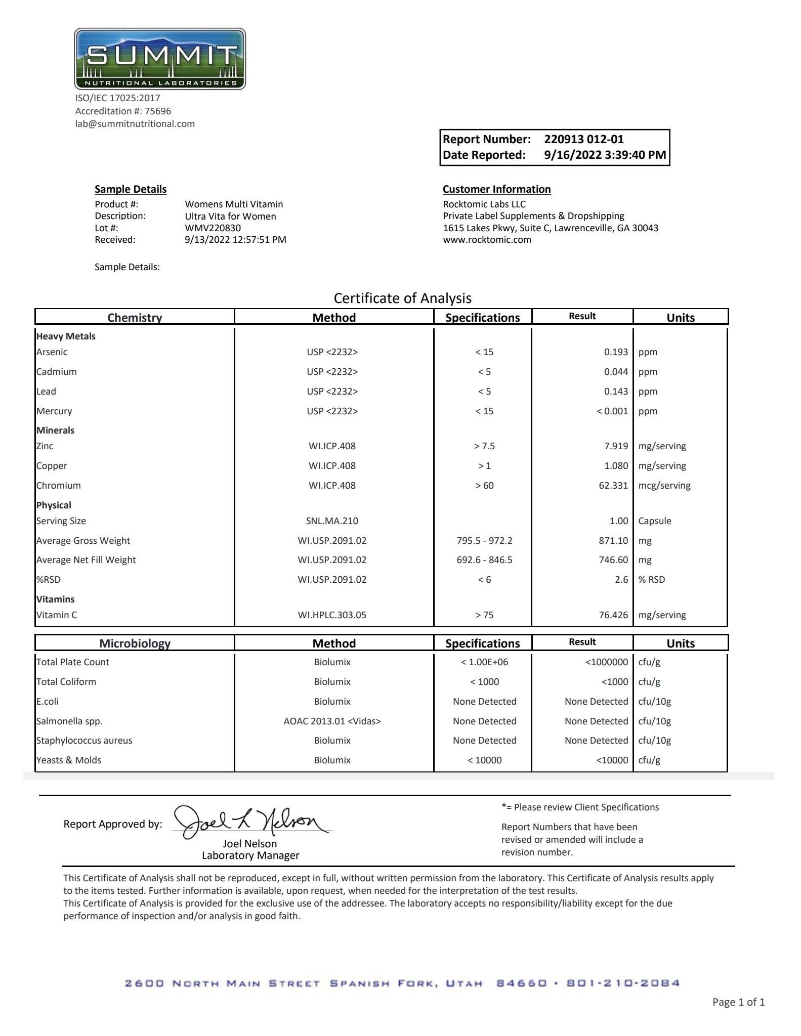 Ultra Vita for Women is formulated to support cardiovascular health, hormonal health, metabolic health, immune health, digestive health, sexual function, cognitive function, positive mood, and improved exercise performance. Our product is synthesized utilizing the latest scientific research and formulated with high-quality ingredients. Our formula is third-party independently tested for heavy metals, impurities, made in the USA, GMP certified, and produced in an FDA registered facility. 1% of the supplements on the market can match our world-class standards. |